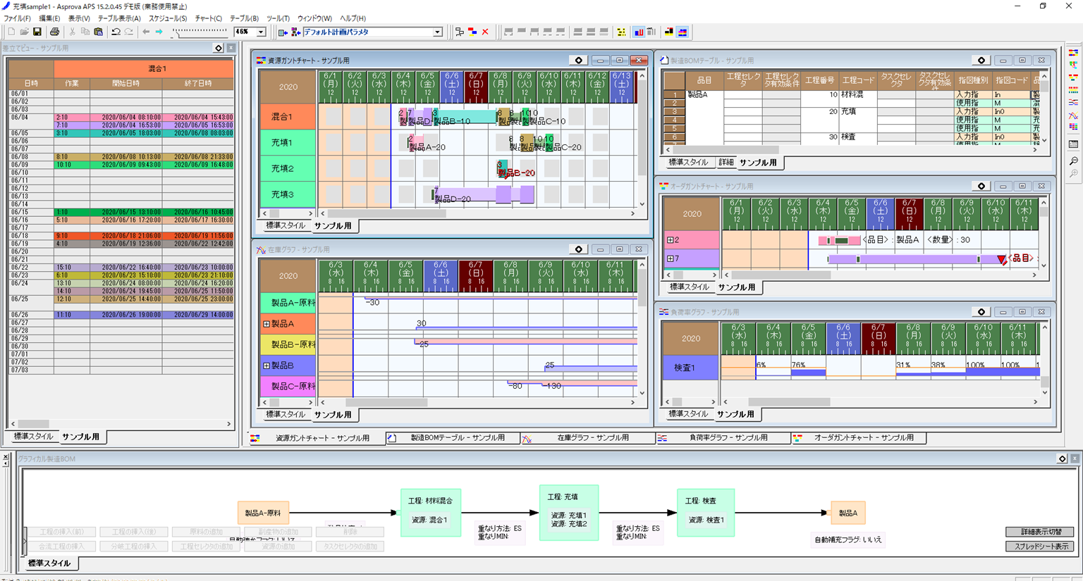 一般的な生産管理システム(およびERPシステムの生産管理機能)にも資材所要量計画(MRP)の機能がありますが、リソースの制約や負荷を加味した精緻な計画の立案はできません。