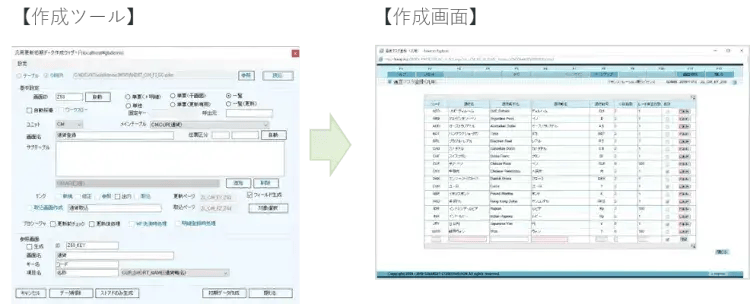 上の例では、作成ツールで通貨マスタ関連の設定を行うことで、通貨マスタ更新画面を簡単に新規作成します。