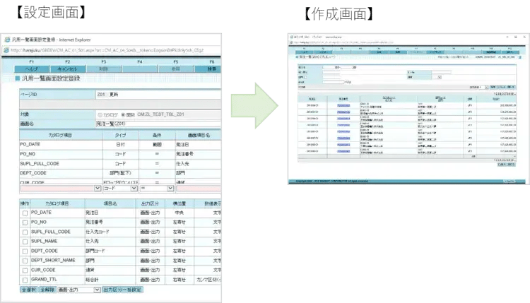 上の例では発注一覧画面を新規作成すべく、設定画面で発注に関する各種情報(発注日、発注番号、仕入先、通貨など)を登録することで、上右画面のような新規の発注一覧画面を作成しています。