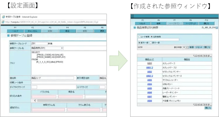 上の例では、参照テーブル登録画面からでウィンドウで表示するテーブルやクエリを登録するだけで、右画面のような商品検索ウィンドウを簡易作成しています。