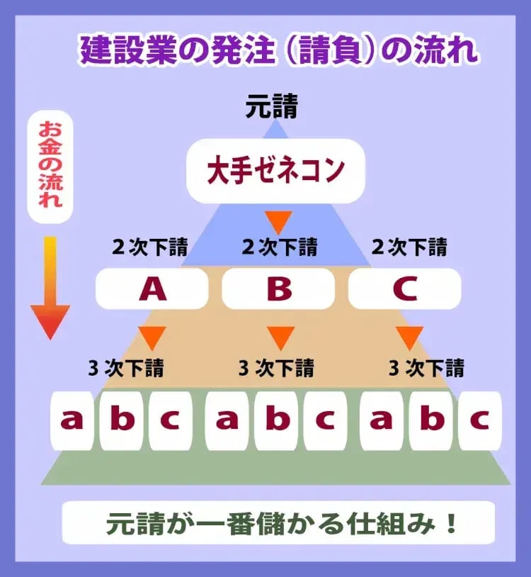 工事業界ではゼネコンといわれる大手企業をトップとして、サブコンや建築設計企業、建材企業や施行管理企業などが仕事を請け負うピラミッド構造が存在しています。ほとんどの場合は「元請け」が存在し、そこから建物を完成させるまでの業務を個別に請け負う「下請け」が存在する仕組みです。