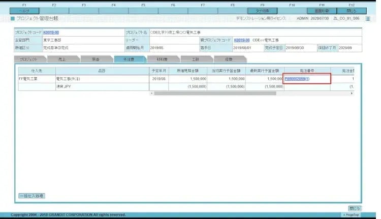 外注費タブの情報としては、仕入先別品目別に発注/仕入情報が表現されます。赤枠の発注番号をクリックすると伝票情報にドリルダウンすることが可能です。このような点が各業務密結合で紐づいているERPパッケージ「GRANDIT」の強みです。