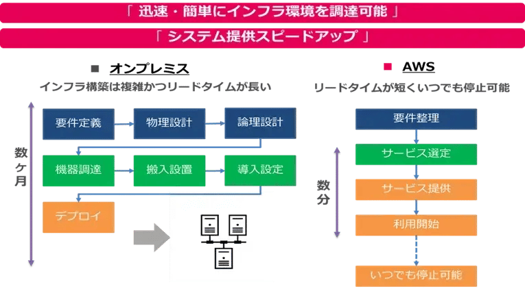 また、サーバを発注後、納品までに数週間以上を要し、納品後はエンジニアがデータセンターへの取り付け作業、ネットワーク設定、OS やミドルウェアのインストールなどを行う必要があり、サービス稼働までに多くの時間と労力を要し、さらに契約書や見積書、注文書などのやり取りも求められました。AWS では、管理者画面や API 経由の操作により、初期費用なし、わずか数分で IT リソースの用意が可能となります。