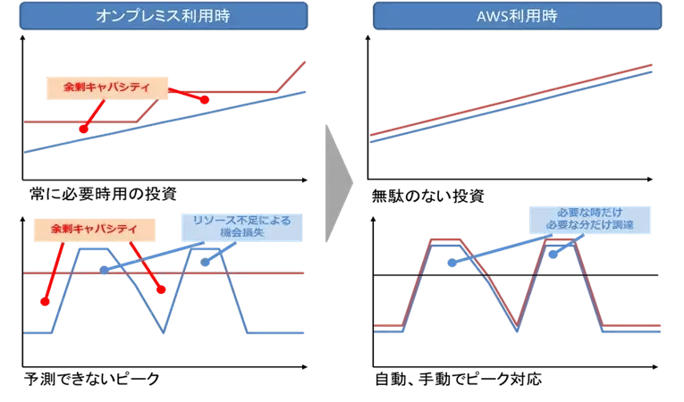 オンプレミスでシステムを準備する場合、常にユーザー数の増加を予測し、その予測を上回る IT リソースを確保している必要がありました。AWS では必要なときに IT リソースを強化することにより、コストを節約することができます。