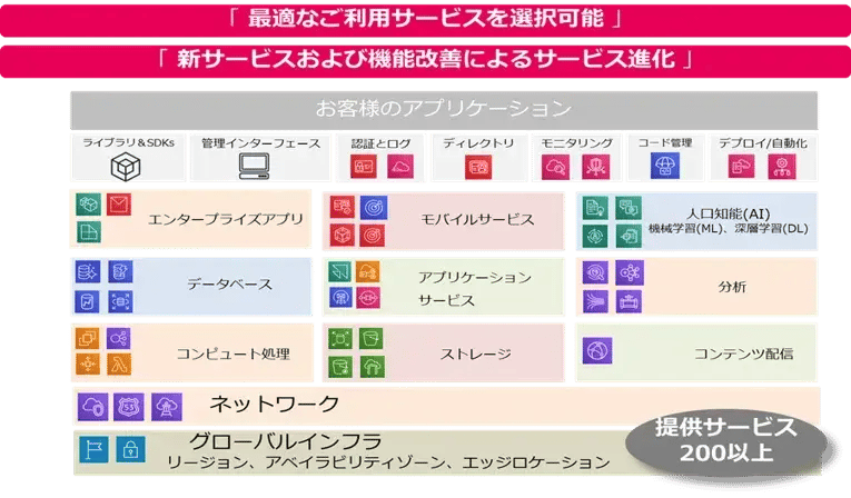 AWS ではデータベース、ストレージ、コンピューティング、分析、ネットワーキング、管理ツール、IoT、セキュリティなど、200 を超えるサービスを提供しております。