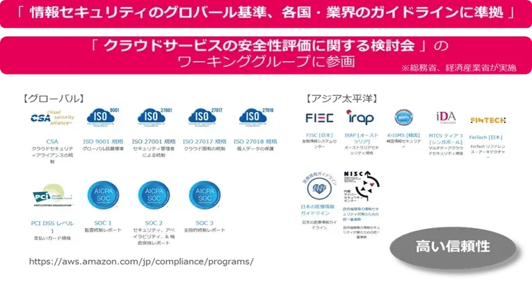 AWS は 2006 年のサービス開始時からクラウドコンピューティングの先駆者として、セキュリティを最優先事項としてお客様のイノベーションに迅速に対応可能なクラウドインフラストラクチャーを創造してきました。AWS では、セキュリティ機能の実装や厳格なコンプライアンス要件に対応し、さらに第三者機関による検証が行われています。