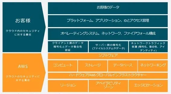 インフラ部分(ホストオペレーティングシステムと仮想化レイヤーから、サービスが運用されている施設の物理的なセキュリティに至るまでの要素)をAWSが運用、管理します。