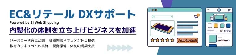 SI Web Shoppingがあることで、高品質なECサイトを素早く立ち上げることができるだけでなく、その後の独自の拡張を行うための社内開発体制構築のご支援まで含まれていることが、DXサポートの最大の特徴です。