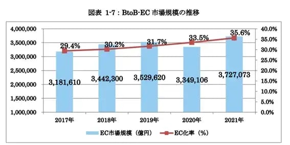 経済産業省が発表した電子商取引に関する市場調査によると、日本国内のBtoBのEC化率は2021年で35.6%です。以下に解説する日本国内全体のBtoCのEC化率を大きく上回っており、全商取引の約1/3がEC化されていることとなります。