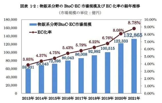 2021年の物販系分野のBtoC EC市場規模は13兆2,865億円で、前年から1兆532億円増加しています。EC化率も8.78%と、前年から0.7ポイント増加。