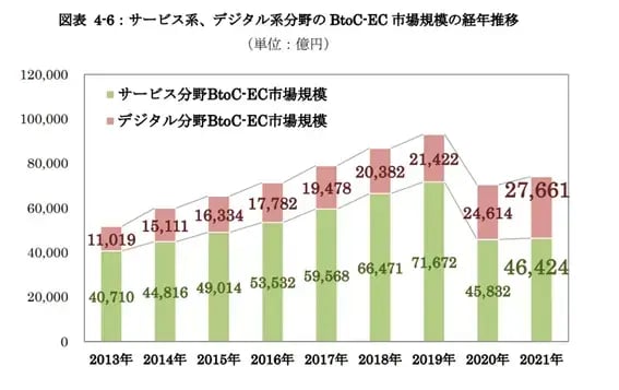 反して、サービス系分野では旅行サービスが大きな割合を占めています。外出自粛が推進されたことから、2020年には旅行サービスや飲食サービス、チケット販売などの市場規模が大きく縮小しました。2021年は前年と比較して市場規模が増加しているものの、まだ2019年以前の水準には戻っていません。