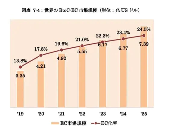 市場規模については、2021年時点で4.92兆USドルとなっていますが、2025年には7.39兆USドル、EC化率は24.5%まで上昇すると予測されています。