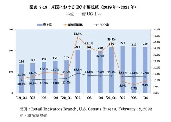 アメリカのEC化率は2021年ではほぼ13%台で推移しています。2020年第二四半期は、新型コロナウイルスの影響による外出禁止などでEC利用が増加していますが。