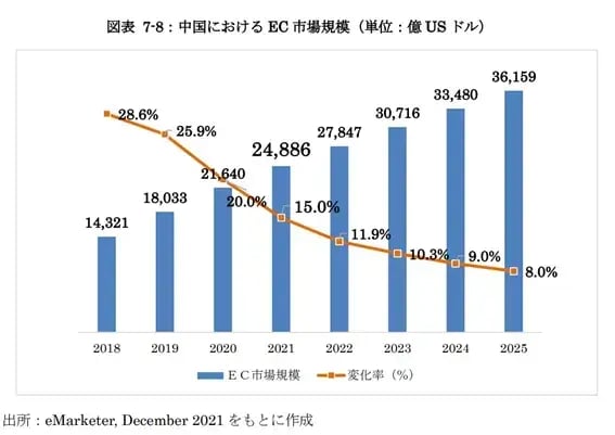 中国のEC化率は日本とは比較にならないほど進んでおり、市場規模も約12倍を軽く上回っています。2025年には中国のEC市場規模は3兆6,159億USドルになると想定されています。