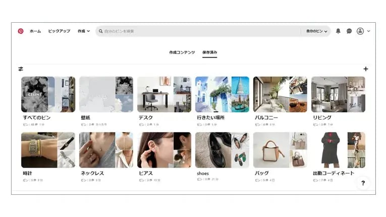 気に入ったピンは、自分のボードに保存することができます。また、ボードは「ピアス」「時計」のように、カテゴリごとに作成できます。非公開にして自分だけで楽しむこともできますし、公開することもできるので、自分と趣味嗜好が似ている他のユーザーのボードを見て新たな発見をすることもできます。