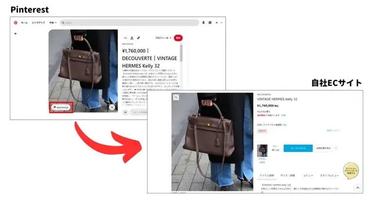また、ピンに記載されているURL(赤枠)をクリックすると自社ECの商品ページへ遷移し、そのまま購入することができます。