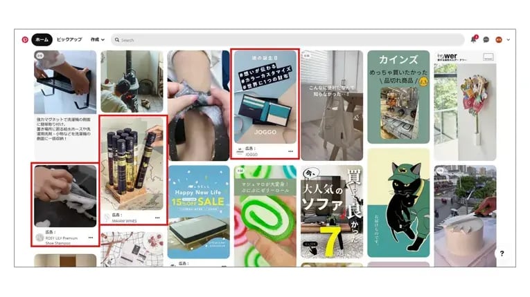Pinterest上で広告を掲載し、より多くの潜在顧客へリーチさせることができます。広告は通常のピンのように表示され、アルゴリズムに従って商品に関心の高いユーザーのホーム画面や検索結果画面に、最適なタイミングで表示されます。通常のピンとなじむように掲載されるので広告感があまり出ないのが特徴です。