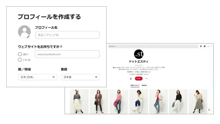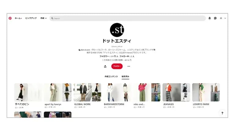 株式会社アダストリアの運営する「ドットエスティ」は、「グローバルワーク」や「ニコアンド」、「ローリーズファーム」などの人気ブランドを始め30を超えるブランドを展開しているファッションサイトです。Pinterestでは「GROBAL WORK」や「niko and,,,」などブランドごとにボードを作成していて、ブランドごとに洋服をチェックできるようにしています。また、チノパンやドレスの特集もあり、ブランドを横断して気になるスタイルの商品の検索もできるようになっています。