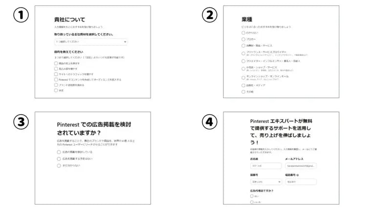 続いて、扱っている商材や業種、Pinterest運用の目的などを設定します。画面の指示に従って設定を進めましょう。後から設定を変更することができます。