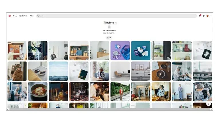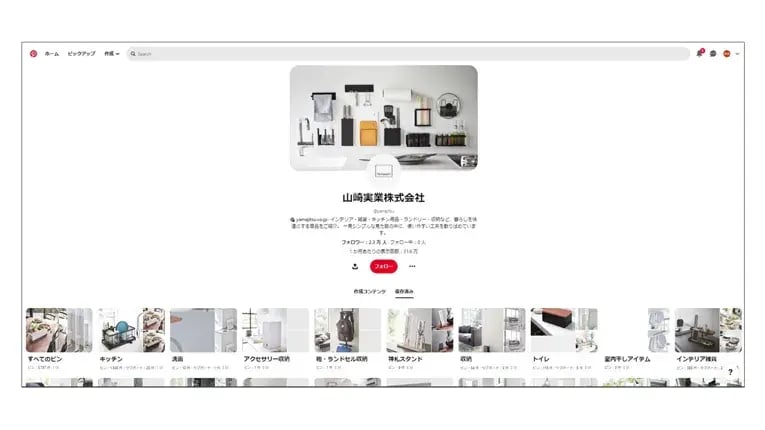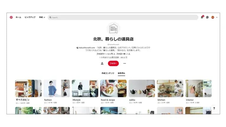 Pinterest上でも、ECサイトと同じように、商品のボードだけではなく、「アイデア」というボードでは収納アイデアをまとめていたり、「ライフスタイル」というボードでは商品ではなく人物を中心とした投稿が多くあり、「北欧のライフスタイル」を感じ取ることができます。PinterestとECサイトとで同じ世界観を表現していて、ユーザーのタッチポイントが違っていても、一貫したブランド体験ができます。