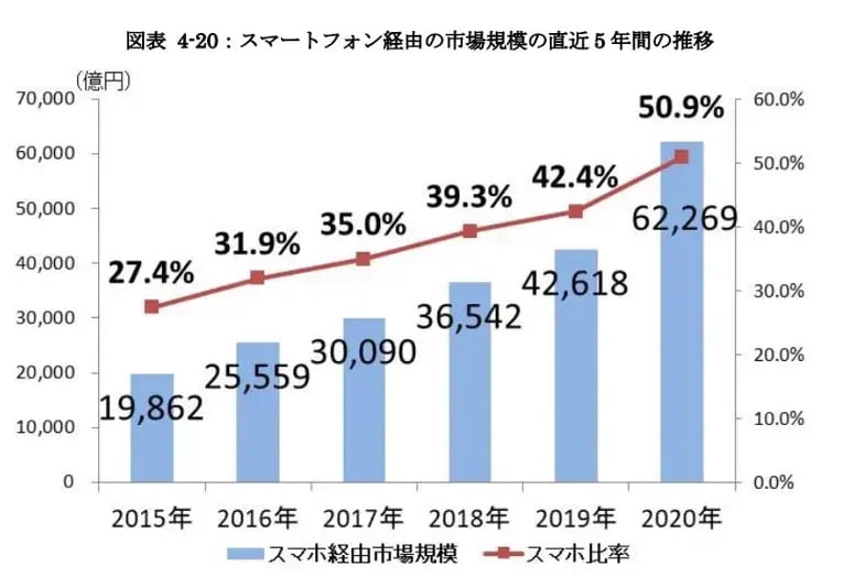また、経済産業省の「電子商取引に関する市場調査」(令和2年度)からも、スマートフォン経由でのEC市場取引が増加していることがうかがえます。