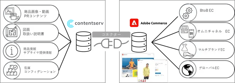 本ソリューションは、商品に関するあらゆる情報を一元的に管理・共有できるContentservと、取引先向けのクローズドなBtoB ECサイトやオープンなECサイトなどをすばやく立ち上げることが可能なAdobe Commerceから成り立っています。この二つのサービスを連携することでBtoB企業のデジタル上の課題を解決し、デジタルトランスフォーメーションをご支援いたします。