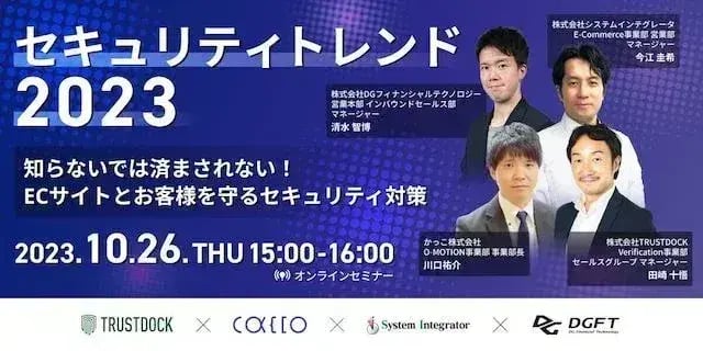 本セミナーでは、ECセキュリティの最前線で活躍するDGフィナンシャルテクノロジー社、かっこ社、システムインテグレータ社、TRUSTDOCK社が、セキュリティ対策のトレンドからAIを活用した不正検知ソリューション、さらにはネットワーク周りのセキュリティやeKYCまで、不正取引対策の全貌を解説。EC事業のさらなる成長のために必須となるセキュリティの最新事情が学べる貴重な機会です。