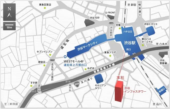本社アクセス:JR 渋谷駅 西口(南改札)より徒歩4分