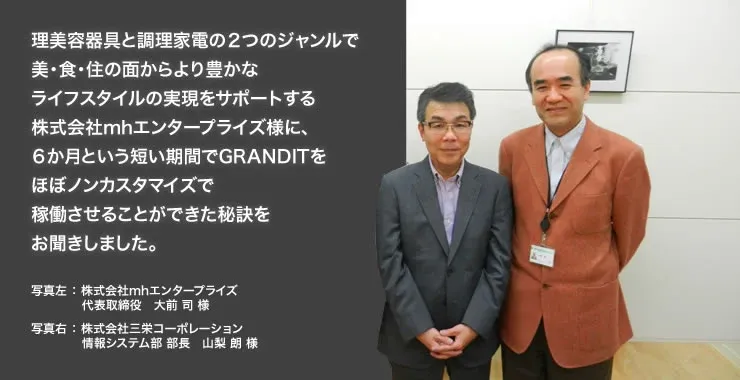 機能の全体構成がしっかりしている点も評価しました。mhエンタープライズにとっては5年程度でシステムをリプレイスというサイクルでは投資負担が大きいと思っていました。と言う訳で、GRANDITはコンセプトがしっかりしていて安定的に長く使えそうと感じたのも大きかったです。また、将来の三栄グループでの展開の可能性も考慮しました。