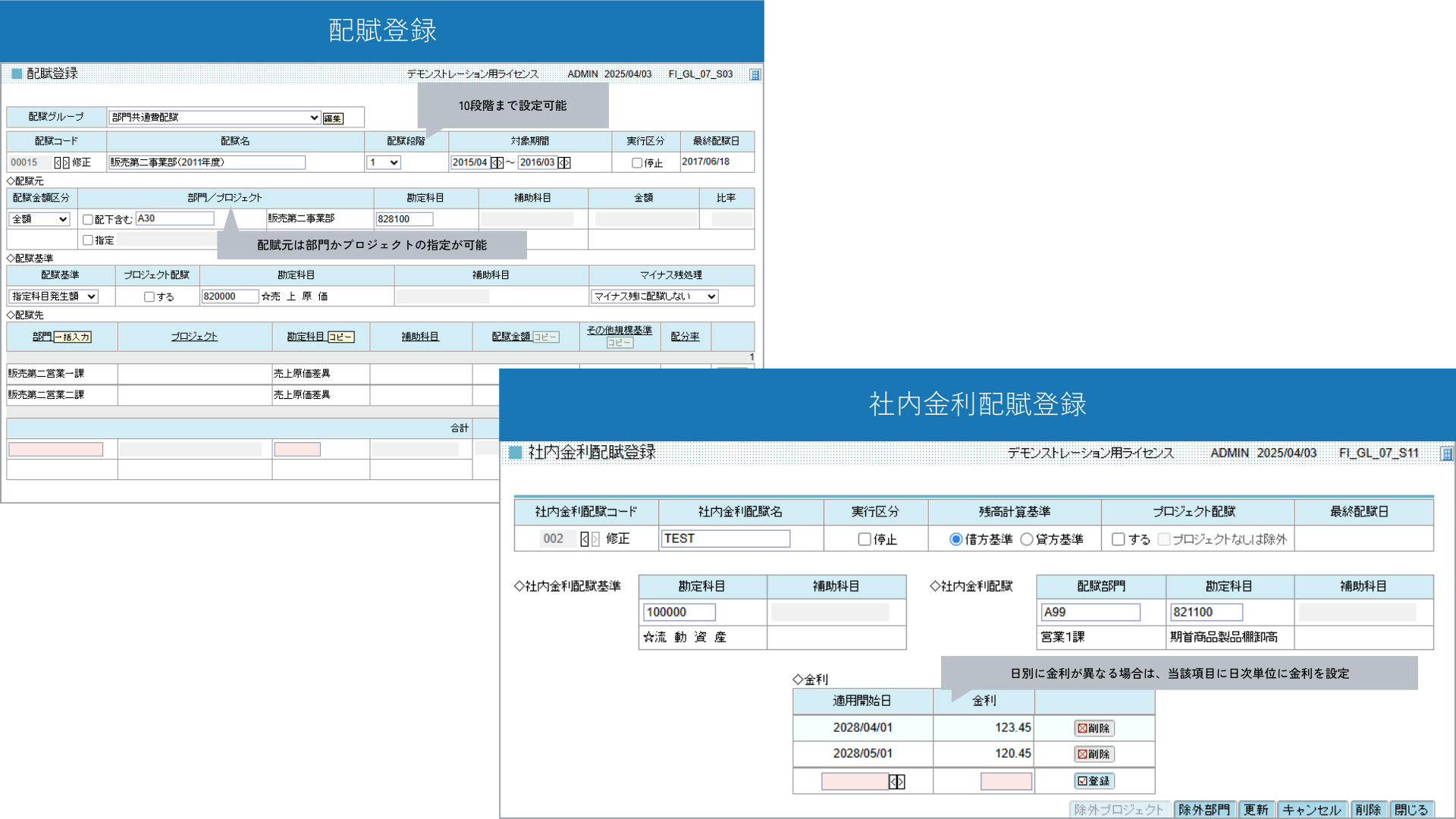 配賦金額は「全額」「固定金額」「比率」から柔軟に設定可能。