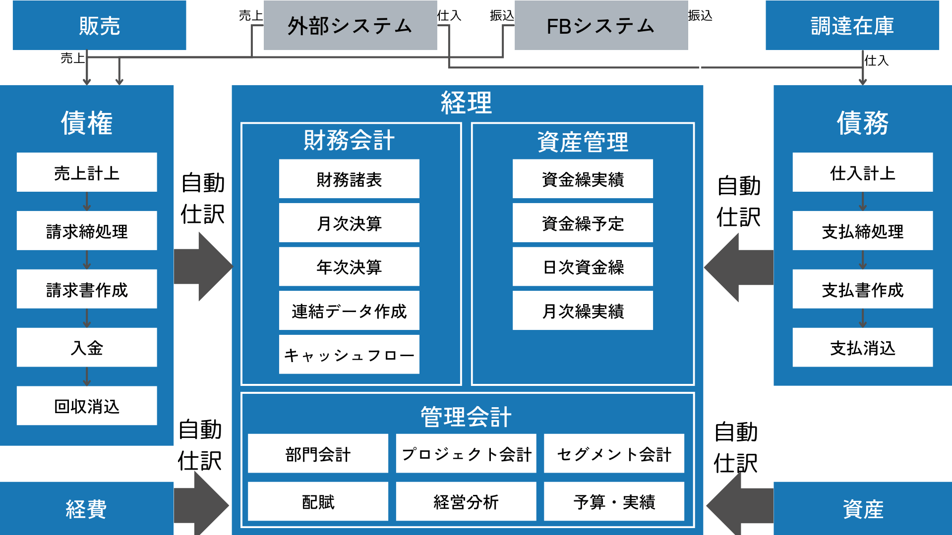 定型業務はすべてスケジューラ機能で自動化し、業務効率化を追求するとともに、部門、プロジェクト、セグメントによる会計情報の管理を実現します。銀行振込、手形、電子記録債権、期日決済など多様な決済方法に対応し、売上、仕入から請求、回収、支払までを管理、外貨建取引にも対応します。経費伝票の現場入力、承認を管理可能です。固定資産やリース資産などの会計処理では、使用部門や設置場所、コストに関する物件管理も可能です。