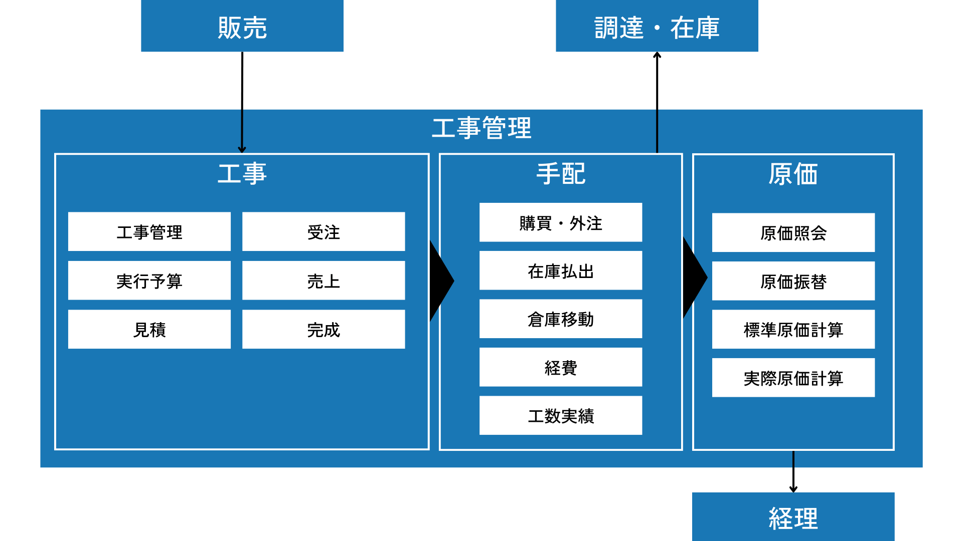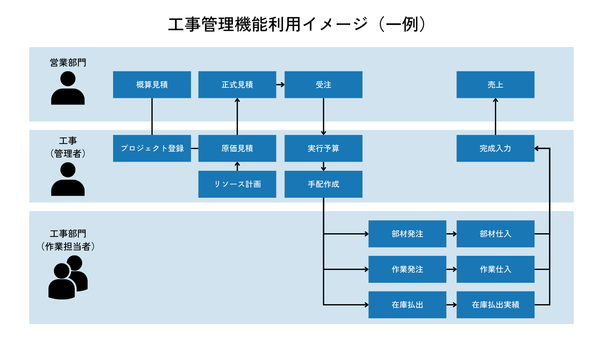 工事契約、工事台帳管理、作業や材料調達の実績管理、生産品の設置・据付などを行う工事・エンジニアリング業界、案件管理、プロジェクト管理、作業工数管理、プロジェクト原価管理などを行うプロジェクト単位で取引を管理するビジネス業界など、工事番号(プロジェクト番号)をキーにして収益管理をする企業の基幹業務を統合的に管理し、「計画通り以上」のプロジェクト成果実現を支援します。
