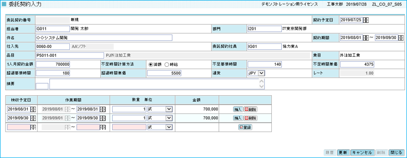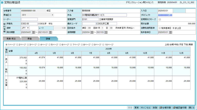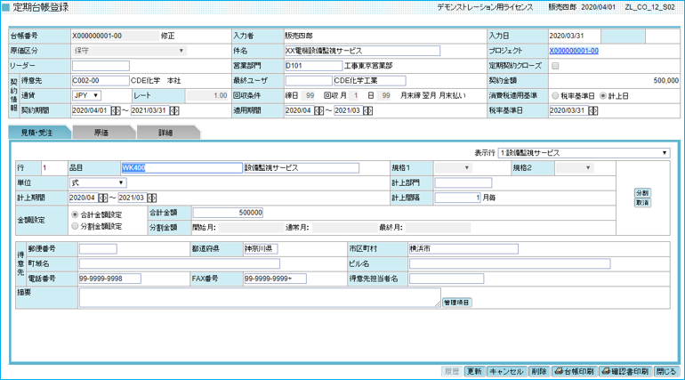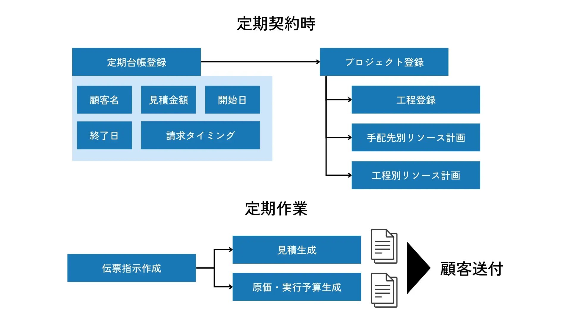 定期的な保守や運用サービスを、定期台帳として登録・管理可能。親プロジェクトとの紐づけ管理にも対応しています。台帳には、保守対象の基本情報に加え、期間・金額・得意先情報などを登録。登録された内容に基づき、見積書や受注伝票を自動作成できるため、業務をスムーズに進められます。