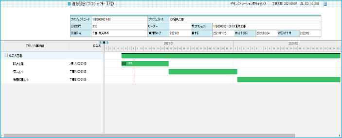 債権債務の標準機能を拡張し、工事ごとに前受金・前渡金・売上・仕入などの状況をリアルタイムで照会可能。さらに、工事単位で作業工程を登録することで、ガントチャートによる進捗確認も実現。工程ごとの担当者登録にも対応しており、担当者別の進捗状況もひと目で把握できます。