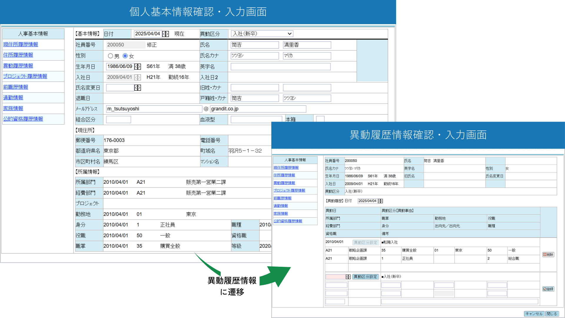 人事基本情報は、GRANDITの統合データベースで販売・会計データと一元管理され、入社から退社まで履歴管理されます。業務に応じた入力メニューも柔軟に作成可能で、人事シミュレーションにも活用できます。すべての個人情報が履歴管理されるため、正確なデータ活用とコンプライアンス強化に貢献します。