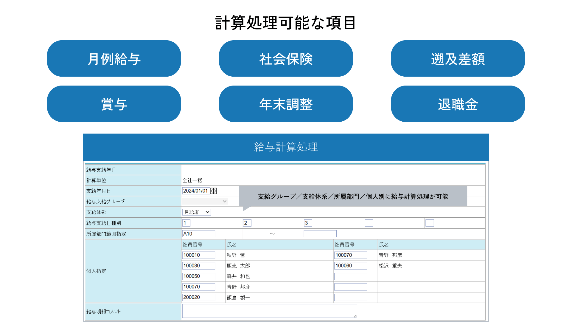 該当する支給月の給与計算を行い、条件指定による対象社員のみの計算も可能です。人事情報と給与データが連動し、計算結果は個人履歴へ自動反映。日割・按分対応や仕訳連携にも対応し、給与業務の標準化と最適化を支えます。