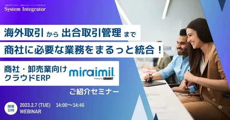 商社は取引形態や商材が多種多様で、取引に関する業務がとても煩雑で独特です。海外取引や出合取引などの商慣習に対応していないシステムでは、業務を効率化できず、スムーズに取引を拡大することができません。このような課題を解決するには、商社業務を統合したシステムの採用が有効です。ですが、これまで商社・卸売業特有の取引形態に対応していないERPが多く、導入費用が高額なため、導入に踏み切れないという企業も少なくありませんでした。しかし、商社・卸売業に最適化された「GRANDIT miraimil」なら安価でスピーディに導入が可能です!本セミナーでは、商社・卸売業向けクラウドERP「GRANDIT miraimil」の機能紹介、具体的な課題の解決策をご紹介します。ぜひご参加ください。
