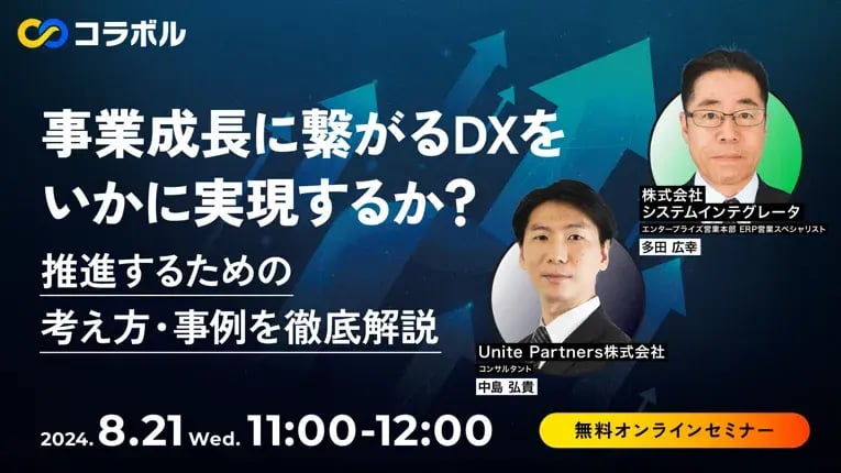 デジタルトランスフォーメーション(DX)は、現代の企業が事業成長を実現するために避けて通れない重要な課題となっています。しかし、実際にDXに取り組む中で「ベストな進め方がわからない」「どこから始めれば良いかわからない」「取り組みが上手くいっていない」といった悩みを抱える企業も少なくありません。本ウェビナーでは、DX推進を成功させるための基本的な考え方や具体的なステップについて詳しく解説します。DX推進の重要性とその戦略については、企業の変革サポートで実績豊富な「Unite Partners」が担当し、具体的な事例を交えながら説明します。また、DXを支えるシステム導入の進め方については、ERP導入の実績がある「システムインテグレータ」が、実際の導入プロセスでの成功のポイントをお伝えします。DX推進に携わる経営者や情報システム部門の方々にとって、実践的で役立つ情報を提供する内容となっています。DX推進の課題を乗り越え、事業成長を加速させるための知識と手法をこの機会にぜひ学んでください。皆様のご参加をお待ちしております。