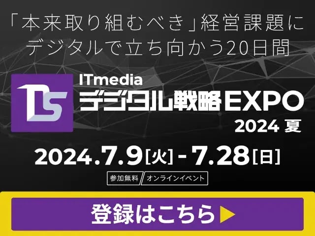 日時:2024年7月9 日(火)~7月28日(日)開催方法:オンライン展示会(セミナー/展示)主催:ITmedia ビジネスオンライン、ITmedia NEWS参加費:無料対象者:企業のデジタル戦略を担う経営層、経営企画、情報システム部門の方/営業、マーケティング、総務・財務経理・法務領域等で自業務における業務改革や、ITツールの導入を推進している方