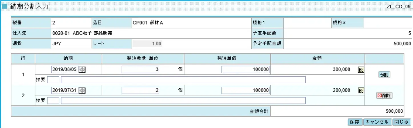 長工期プロジェクトにおける部材購買の分納や作業発注の分割検収に対応可能です。実行予算に登録された各明細情報(発注・作業発注・在庫払出)を基に手配データを一括生成し、発注品の分納や作業発注に関する分割検収などがある場合、納期ごとに発注数量や発注予算の予定情報入力が可能です。