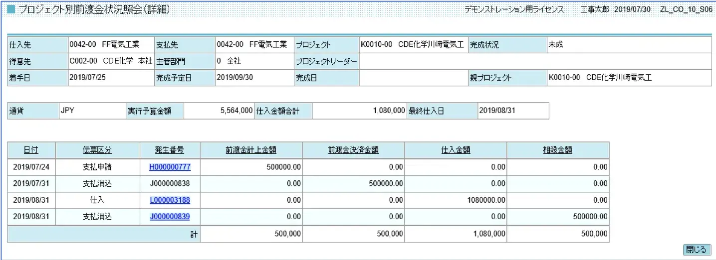 工事業では、工事を着手する時や完成引渡しの前に分割して入金が行われる時があるため、前受金(未成工事受入金)、前渡金(未成工事支出金)の管理は重要です。GRANDITでは工事ごとの前受金・前渡金の発生状況のほか、当該工事に紐づく売上伝票・仕入伝票をドリルダウンにて確認することが可能です。