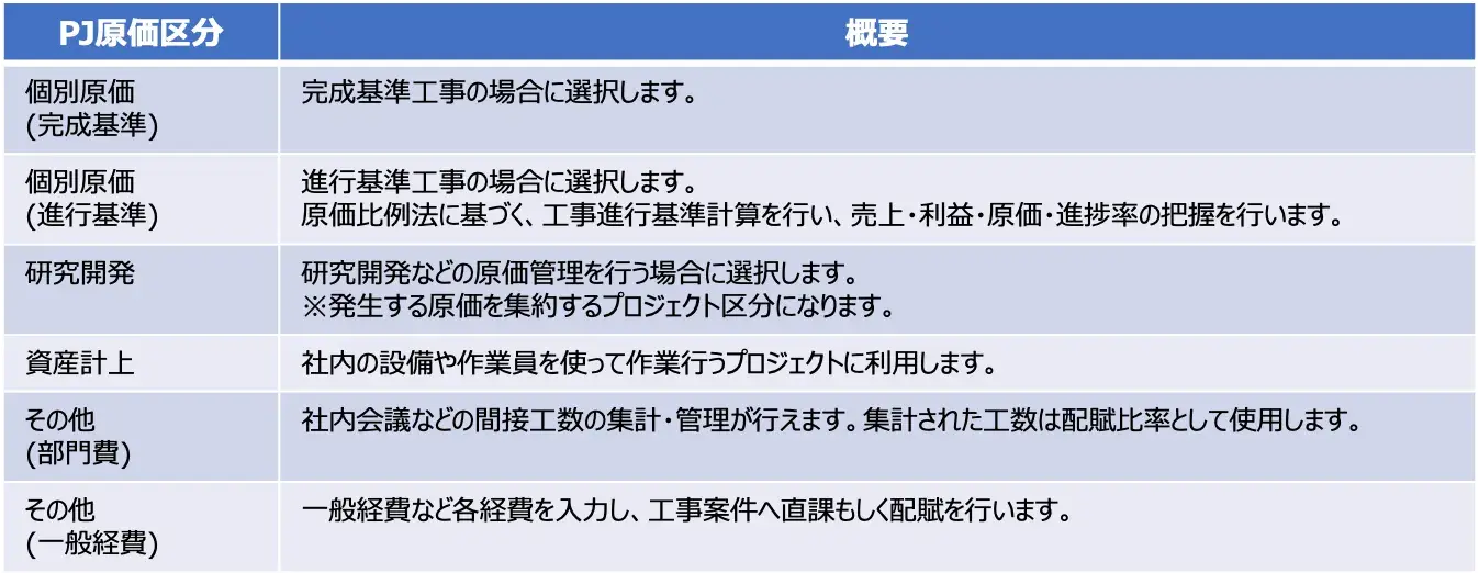 工事業の売上や原価を収益や費用に収益する費用については、工事完成基準と工事進行基準のどちらかに原則適応する必要があります。GRANDITでは案件の特性(進行基準、完成基準など)に応じてて、プロジェクト原価区分の選択が可能です。