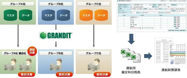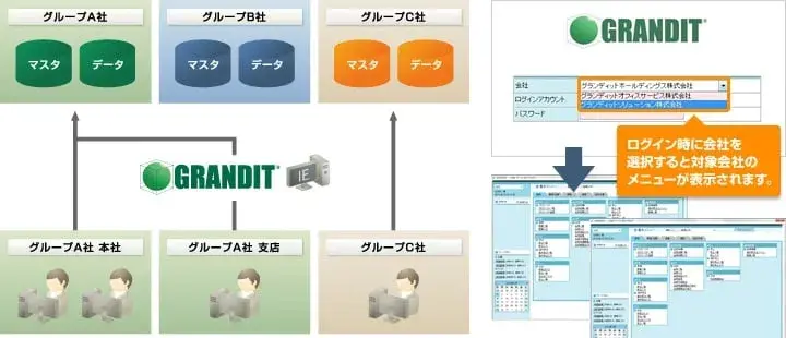 GRANDITはグループ会社での利用を想定した「マルチカンパニー」機能を用意しており、複数の企業で同一のシステム環境を利用することが可能です。また、データは個社別に管理されるため、システム利用者は自社システムとして利用することが可能です。