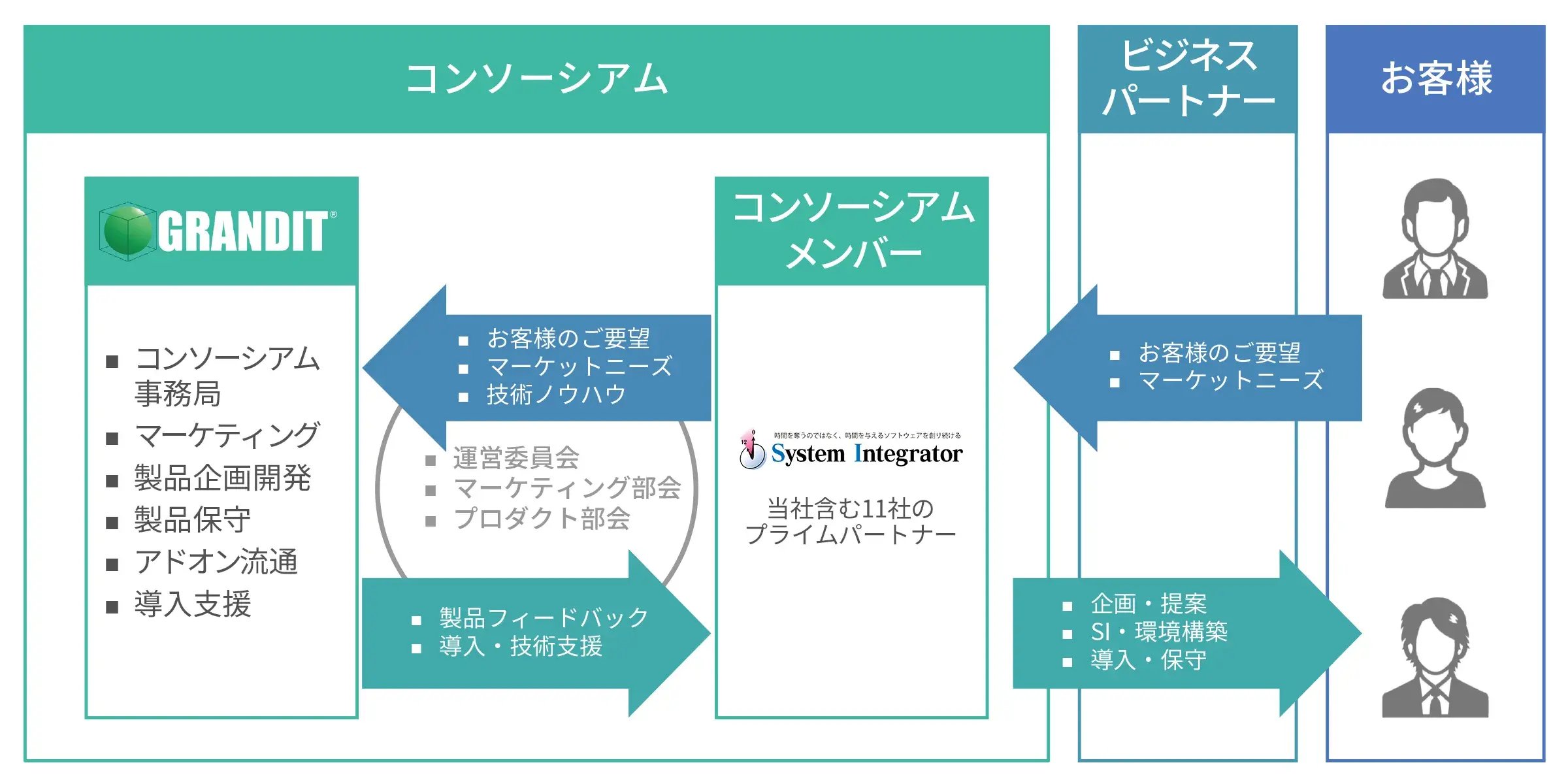 GRANDITは、11社のプライムパートナーからなるコンソーシアム方式で運営されているERPです。当社は2004年7月にリリースしたGRANDIT初期版の企画・開発から参画しており、プライムパートナーの一員として、GRANDITの発展に貢献しております。