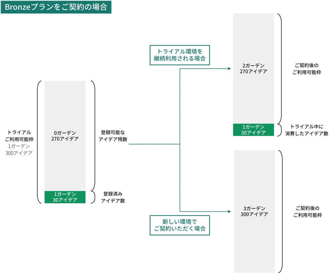 「登録したアイデア数=獲得した価値」という考えのもと、ガーデンとアイデアの年間登録数に応じた料金体系となっています。1カ月間無料でご利用いただけるトライアルプランもございますので、ぜひアイデアソンなどを開催して使用感や効果をご確認ください。