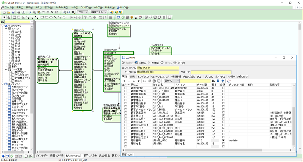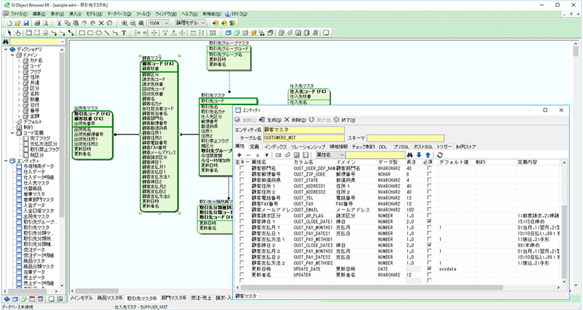 カラムのテンプレートを作成することで設計品質を高めるドメイン機能、サブモデル分割やマージ機能、エンティティリストや属性リストなどの各種リスト機能、IDEF1X/IE表記の切り替え、エンティティや列ごとの論理モデル/物理モデルが管理できるなど、高度なモデリング機能も多く用意しています。