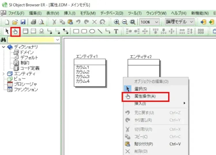 OBERには、属性操作モードというものがあります。このモードはその名の通り属性(とエンティティ名)を操作できるようになるモードです。特別すごくなさそうに聞こえますが、なんとこの操作がエディタを開かずにモデル上でできるようになるんです。