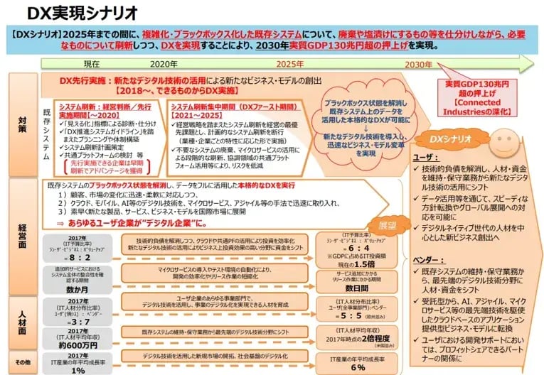 DXレポートでは、2025年までにDX実現を目指すための「DX実現シナリオ」を打ち出しています。これまで解説した課題に対して対策を行い、このDX実現シナリオを行うことで、2030年実質GDP130兆円超の押上げを目指しています。