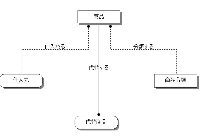 上記のような依存関係にあたらないリレーションシップです。図7の「顧客」と「商品」を結ぶリレーションシップが非依存となっています。注文した顧客が1人もいないときでも商品自体は販売している(存在できる)ためです。非依存リレーションシップの場合は点線で引きます。
