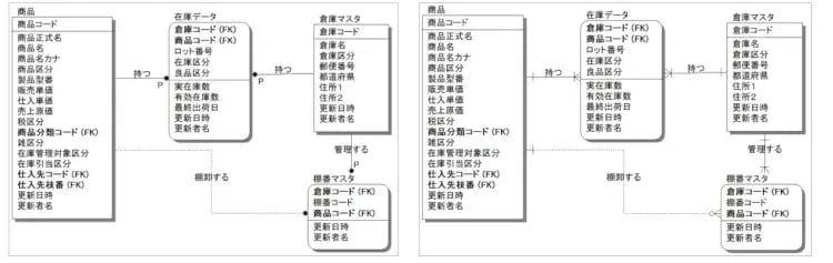 また、ER図にはいくつかの書き方(表記法)があります。代表的なのはIDEF1X(アイデフワンエックス、Integreation Definition 1Xの略)表記とIE(アイイー、Information Engineering)表記です。図5の左がIDEF1X、右がIE表記の例です。